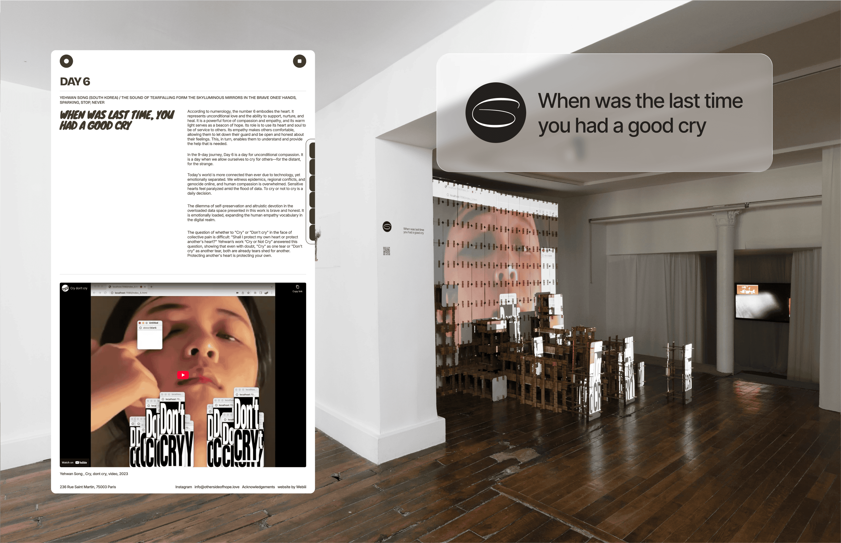 Day 6 alongside Yehwan Song's mirror installation — website and physical exhibition in the same frame.